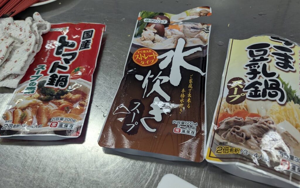 GC「水炊きスープ」、GC「ごま豆乳鍋スープ(2倍希釈)」、GC「国産トマト鍋スープの素」の3種類のお鍋を食べました。