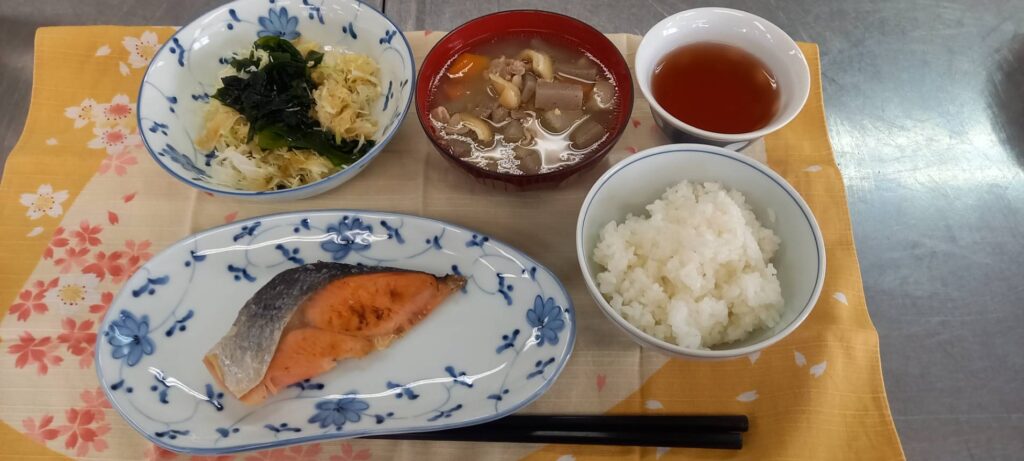 同時進行で「うまうま塩秋鮭」を焼き、「サラダ」「豚汁」「ご飯」でランチ会の準備をし、皆でいただきますをして食べました。今回は「鮭フレーク」「鮭フレーク(ノンオイル)」「焼きほぐし」の3種類のフレークの食べ比べもしました。話も弾み、お腹いっぱい食べられて楽しい時間となりました。