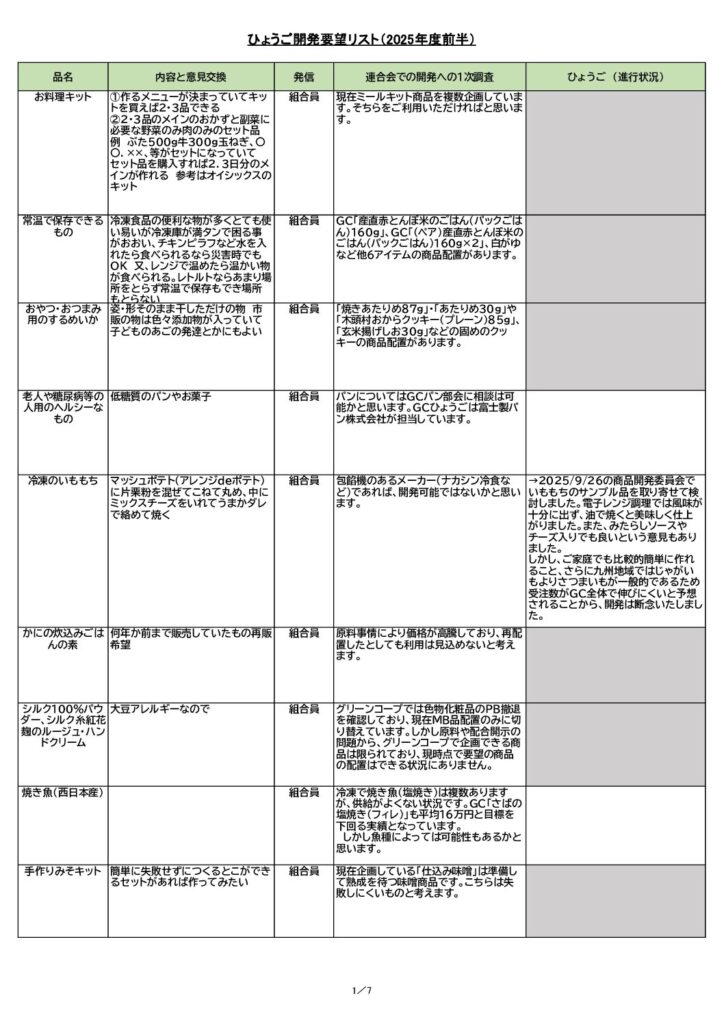 商品開発委員会では、組合員からの「こんな商品があったらいいな」という皆さまからの要望をもとに新たな商品を開発しています。こちらのリストでは、2025年度前半に皆様から頂いた要望をまとめ、結果や進捗状況を確認することができます。2月9日より配布のチラシ掲載のQRコードより要望を受け付けておりますので、気軽にフォームからご記入くださいね。配布チラシの裏面には直接記入できる用紙もありますので、そちらからのご応募も大歓迎です!たくさんのご応募、お待ちしております。