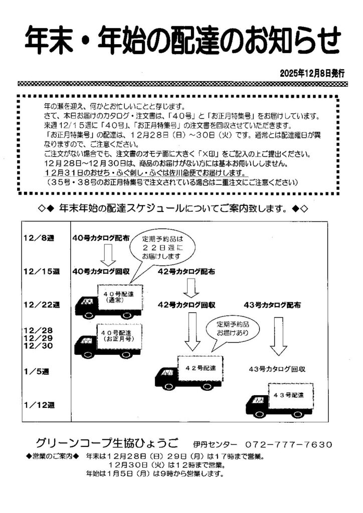 12月になり、何かとあわただしい時期になりました。12月8日~配布カタログは40号とお正月特集号をお届けします。「お正月特集号」は、配達日が12/28(日)~30(火)となり、通常とは配達曜日が異なりますのでご注意ください。定期予約の商品は、12/22~週までお届け致します。年明け最初の1/5~週・42号の注文用紙は12/22~週に回収させていただきますので、注文忘れのないよう年内にご提出くださいね。