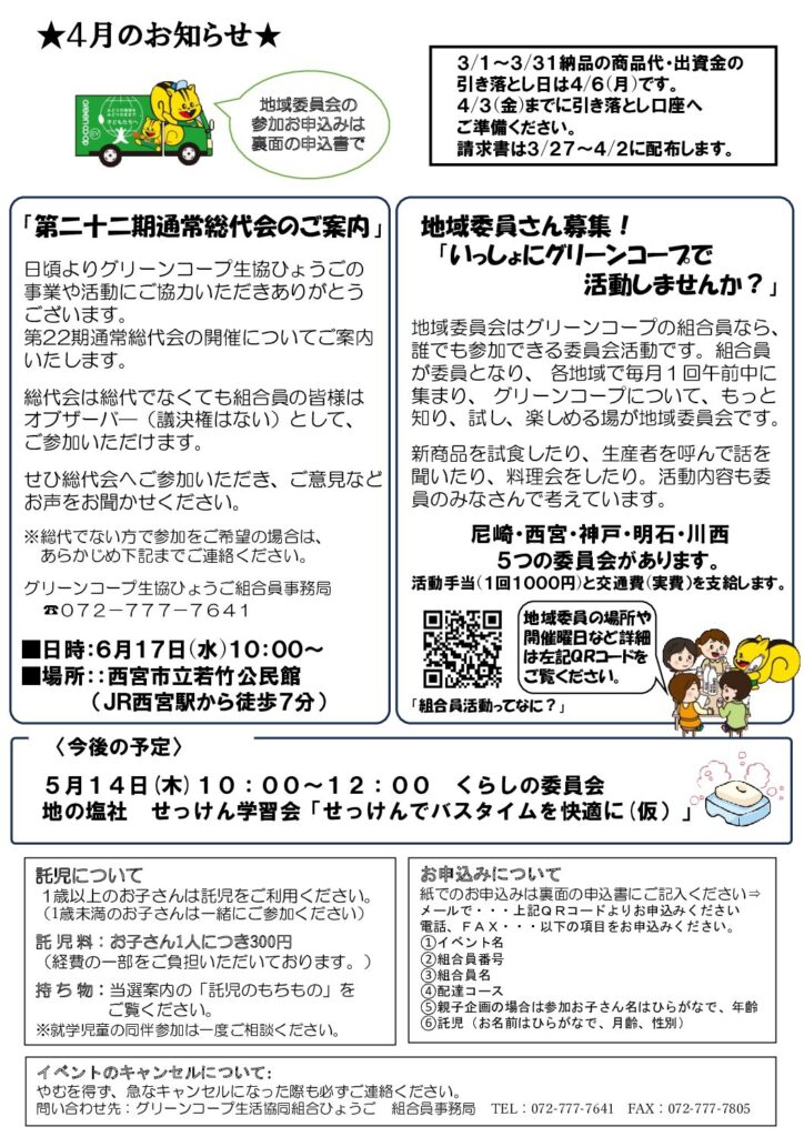 厳しい冬が終わり、桜の季節がやってきました。これから始まる新生活に、期待で胸を膨らませている方も多いのではないでしょうか?6月17日(水)に総代会を行います。総代会は、グリーンコープ生協ひょうごの2025年度の報告をし、来年度の方針を決める大切な会議です。組合員の皆様は、オブザーバーとしてのご参加が可能です。また、現在地域委員さんを募集中です。グリーンコープの商品を試食したり、生産者さんを呼んでこだわりをお聞きしたりして楽しめる場です。同じ地域の組合員さんとつながりが出来るので、とても楽しいですよ♪分からないことがあれば、お気軽に組合員事務局までお問い合わせください!
