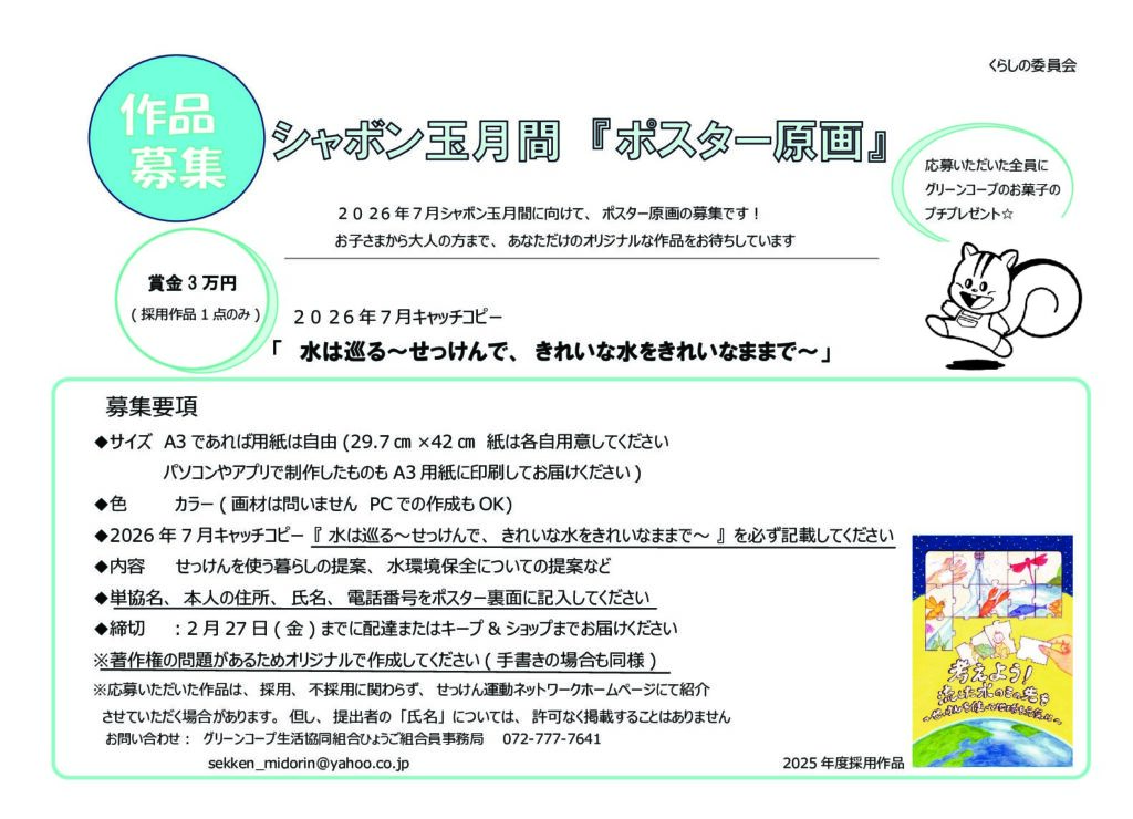 2026年度の7月のシャボン玉月間に向けて、カタログや様々なシーンで活用されるポスター原画を募集します。グリーンコープだけではなく、せっけん運動ネットワークに加盟している生協の組合員やご家族の方から募集し、その中で選ばれた作品は他の生協などでもシャボン玉月間のPRに使われます。昨年は、ひょうごから見事作品が選ばれました!!ご本人はもちろん、お子さんやご家族の方にぜひお声がけください。また、応募いただいた方全員に、グリーンコープのお菓子をプレゼント致します。あなたのお子さんの絵がカタログに掲載されるかも??たくさんのご応募、お待ちしております。