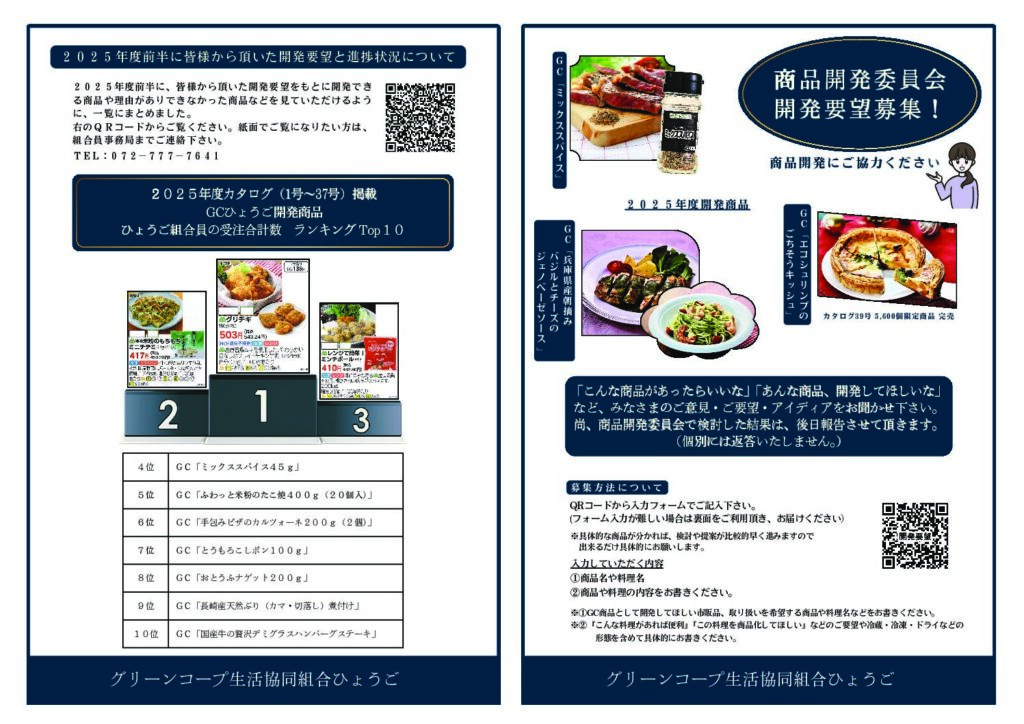 商品開発委員会では、皆さまから頂いた開発要望をもとに新商品の開発検討に取り組んでいます。「子どもにアレルギーがあるので、こんなお菓子を作ってほしい」「ソイミートのおかずを開発してほしい」などなど、要望をぜひお届けください。2025年度前半に検討した要望と進捗状況をチラシに掲載のQRコードから見ることができますので、参考になさってください。あなたの「こんなのがほしい!」といったアイデアが、グリーンコープの商品となってカタログに掲載するかもしれません!ご要望はQRコードからフォームで記入できます。たくさんの方からのご意見をお待ちしております。