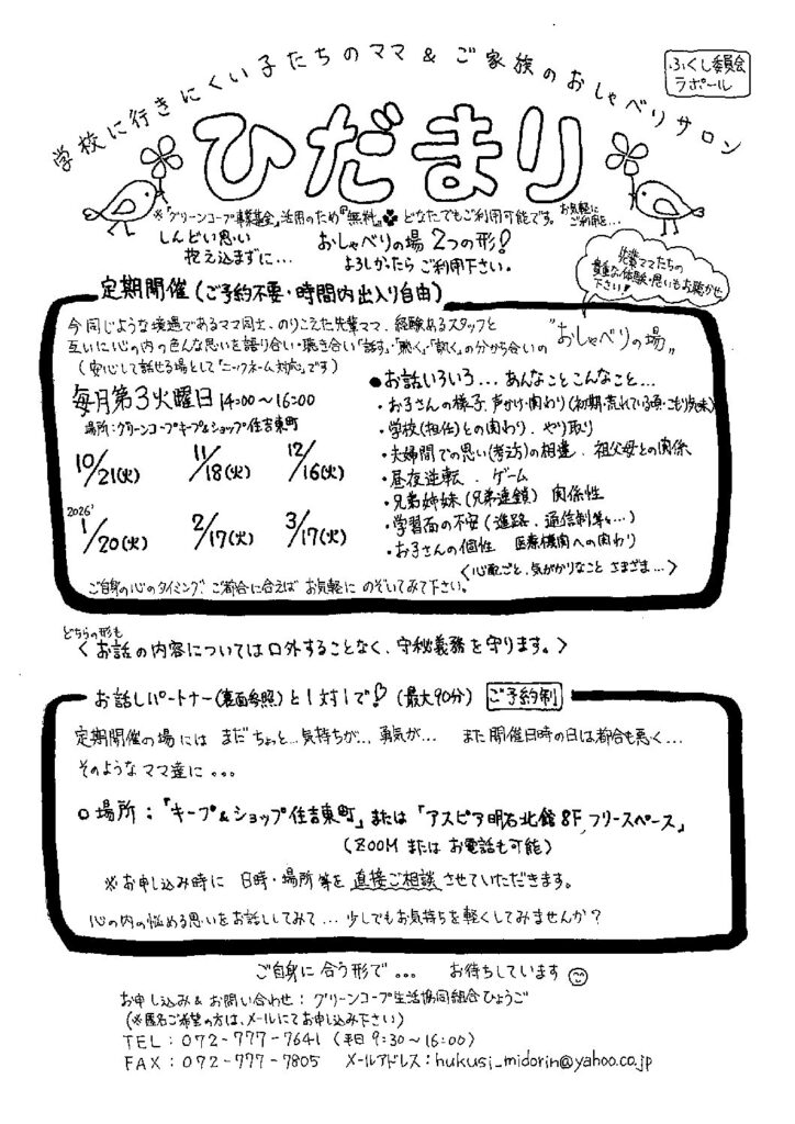PDFはこちら→学校に行きにくい子たちのママ&ご家族のおしゃべりサロン「ひだまり」