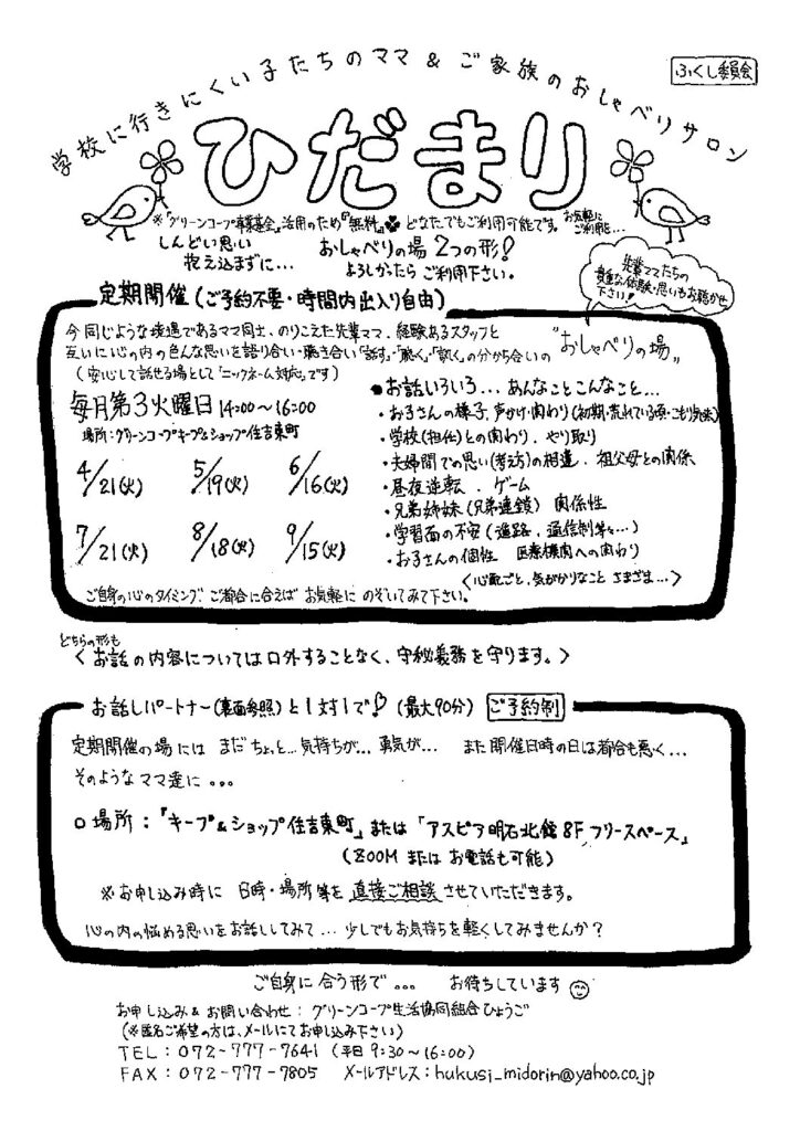 学校に行きにくい子たちのママ&ご家族のおしゃべりサロン ひだまり