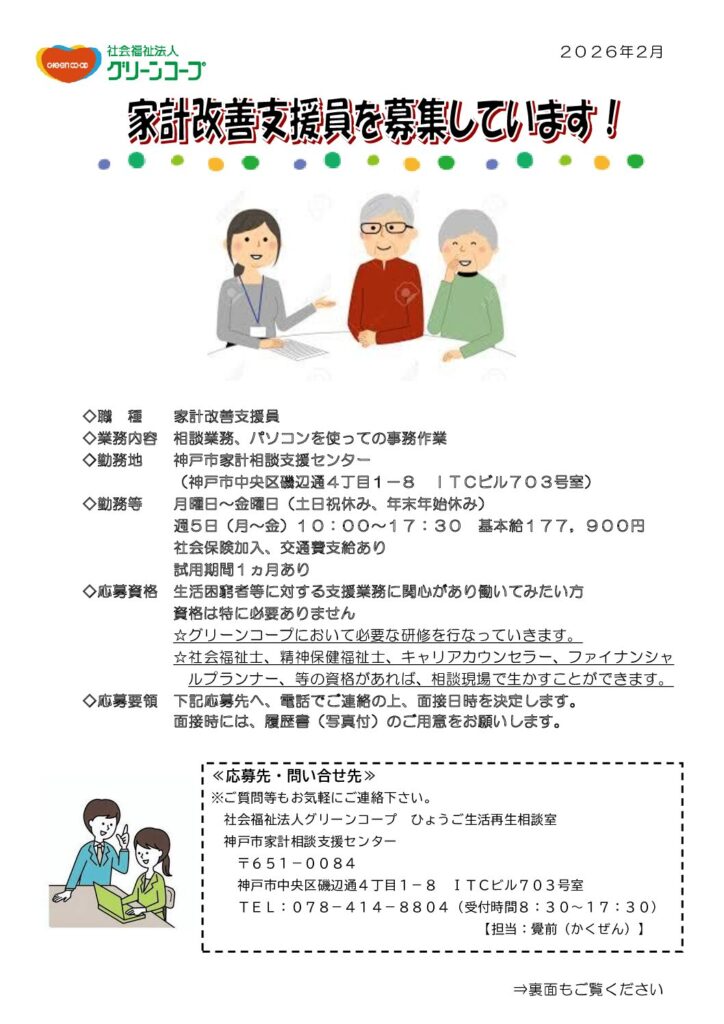 グリーンコープ生協ひょうごの生活再生相談室では、自治体から家計改善支援事業を受託し相談員が生活に困っている方の支援に取り組んでいます。今回、新たに家計改善支援員を募集します。生活困窮者などに対する支援業務に関心があり働いてみたい方なら、資格は特に必要ありません。グリーンコープにて必要な研修を行い、最初の2~3か月はベテラン相談員さんと一緒に行動していきます。福祉などに関する資格をお持ちの方は、相談現場で生かすことができます。ご不明な点や詳しいことは、下記チラシ案内の連絡先までお問合せください。