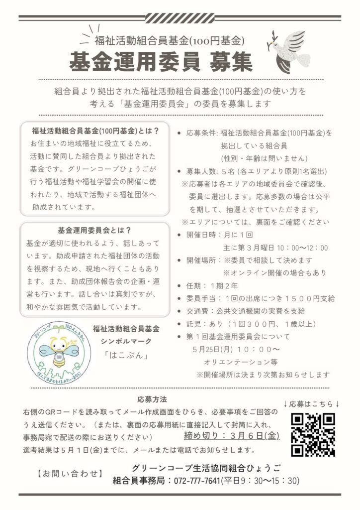 PDFはこちら→100円基金(福祉活動組合員基金)運用委員 募集案内