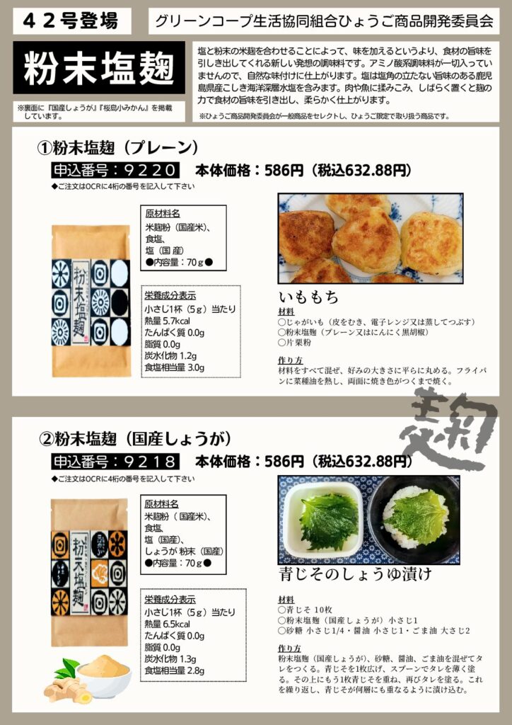 お待たせしました!42号(12/15~配布・1/5~商品お届け)では、ひょうご開発商品の粉末塩麴が4種すべて注文できます。