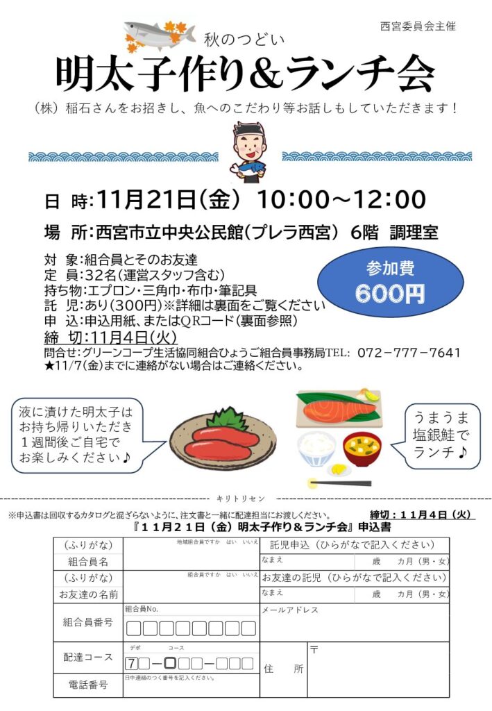 いつも大人気の秋のつどい。今年の西宮委員会では、なんと明太子を手作りします!今回はメーカーの(株)稲石さんをお迎えし、楽しいお話を交えながらの講習です。ご自身で作られた明太子はお持ち帰りいただき、当日は塩銀鮭のランチも作ります。めったにないこのチャンスをお見逃しなく!!申込み方法は、チラシ下記の用紙またはQRコードどちらでもOKです。たくさんのご参加をお待ちしております。