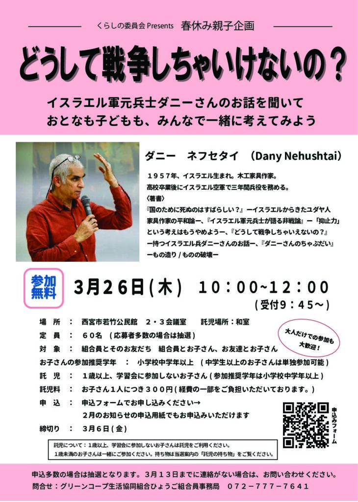 『どうして戦争しちゃいけないの?』の著者、イスラエル軍元兵士のダニーさんを講師にお迎えして、親子平和学習会を開催します。参加推奨学年は小学校の中学年以上ですが、中学生以上のお子さんなら単独で参加可能ですので、ご自身が行けなくてもお子さんだけの参加申込みができます。もちろん、大人だけの参加も大歓迎です!春休みの特別企画、お子さんとぜひ一緒に参加しませんか?