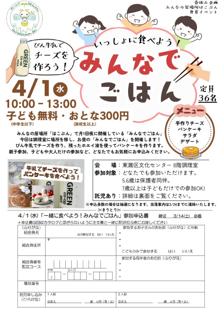 みんなの居場所「はこぶん」で月に1回夜に開催している「みんなでごはん」が、今回調理室に場所を移動してお昼に開催します。GCのびん牛乳でチーズを作って、残ったホエイ液でパンケーキを作ります!親子参加はもちろん、子どもや大人だけでの参加もOKです※。毎回たくさんの方からお申込みをいただく大人気のイベントです。牛乳が苦手な方も楽しめるメニューですので、ぜひこの機会に楽しみませんか?スタッフ一同、お待ちしております。